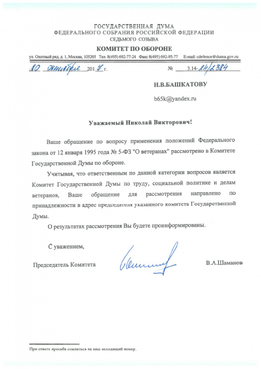 Ответ военному пенсионеру из Комитета по обороне