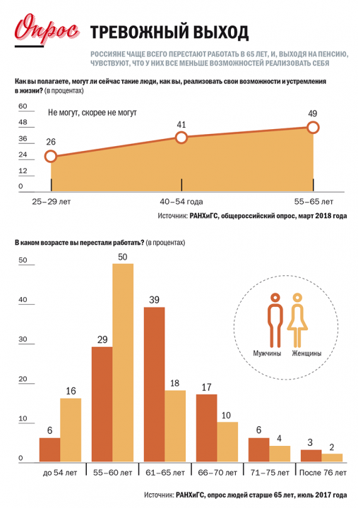 — В пенсионной сфере не может быть реактивных действий, повторю, нельзя просто взять и убрать льготы. Нужно вносить рациональность в жизнь человека, а не ставить его перед катастрофическим выбором в момент, когда у него и так стрессов полно: пенсия впереди, здоровье хреновое, с детьми как-то все не так, как виделось, а тут еще и это по голове прилетело… От внезапной отмены льгот социальные последствия будут еще более тяжелыми. Что, впрочем, не отменяет проблемы: саму систему льготных пенсий нужно пересматривать. Мы опрашивали балерин, которые выходят на пенсию до 40 лет, опрашивали военных, выходящих до 45 лет, и скажу, что эти люди однозначно не собираются «на покой». Законодатель считает, что у них подорвано здоровье, но эта «подорванность» если и имеет место, то только применительно к их первой профильной специальности. Балерина не может танцевать в кордебалете, но в 40 лет она может научиться чему-то еще. Сейчас и для инвалида-колясочника существует масса профессий, открывшихся с интернетом. Поэтому льготные сроки выхода на пенсию должны быть не «точками отставки», а «точками карьерного перехода». Но при этом просто отменить льготы и не замечать их, сказать — работайте дальше — нельзя. Требуется построить систему, которая могла бы компенсировать возможный разлом карьеры конкретного человека, предложить ему новые виды занятости. Люди, которые имели спортивный или военный опыт, обладают колоссальным эмоциональным и физическим капиталом. Они могут пригодиться не только как фитнес-тренеры, но и как надежные исполнители самых разных задач, и их трудоустройство после 40 должно быть в том числе и государственной заботой.